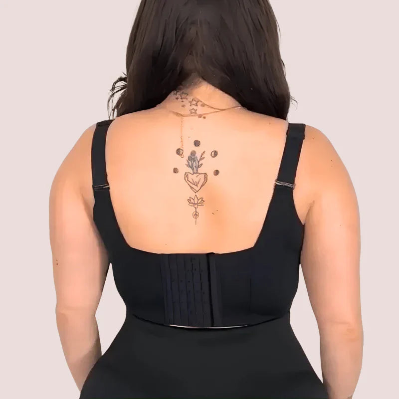 El secreto reside en su diseño ergonómico. La banda dorsal extra ancha distribuye uniformemente la presión y envuelve delicadamente su espalda, alisando los contornos y minimizando la aparición de pliegues.